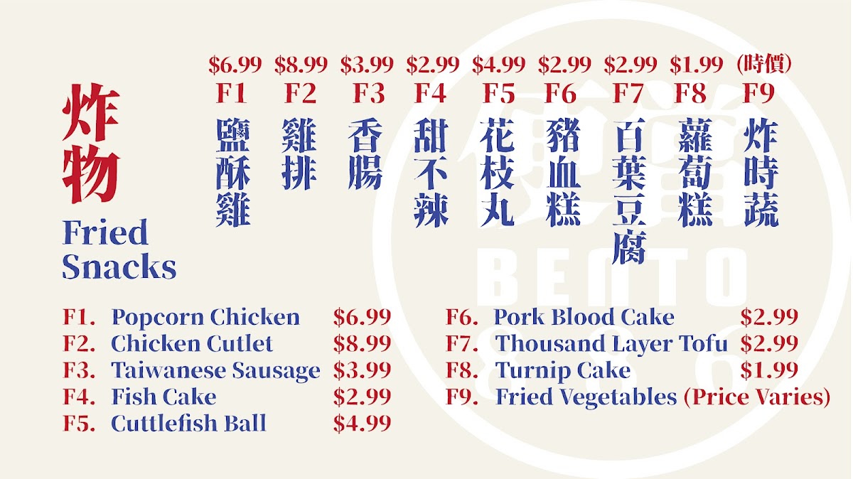 Vegetarian diners are equally catered to, with options like the Fried Vegetables Bento that features a vibrant mix of stir-fried seasonal vegetables—a satisfying choice that doesn't compromise on flavor. And don't overlook the tempting appetizers, like the Taiwanese Fried Oyster, which are a burst of umami with a perfectly crispy exterior, or the addictive Sweet Potato Balls that are sweet, crunchy, and just the right amount of chewy.